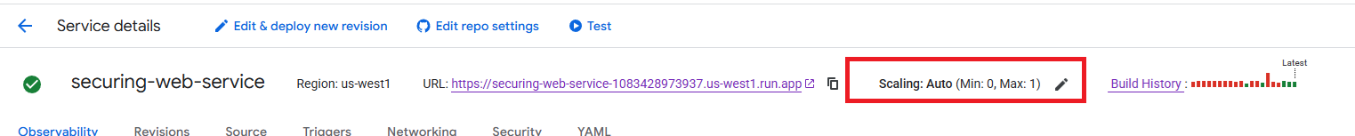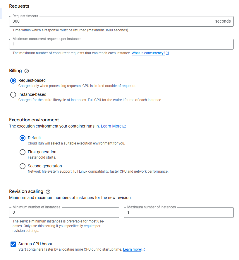 Podczas wgrywania przez Google CLoud SDK, nie istnieje wybór obsłużeń połączeń, ani instancje CPU dla Revision scaling. Można to jednak edytować używając opcji "Edit & deploy new revision"